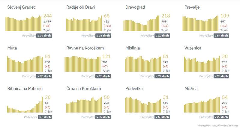 Na Koroškem so največ novih okužb zabeležili v Slovenj Gradcu in Radljah ob Dravi, kjer so jih potrdili po 16. V Dravogradu 11, na Prevaljah 10, na Muti 8, na Ravnah na Koroškem in v Mislinji po 7, v Ribnici na Pohorju in v Vuzenici po 6, v Črni na Koroškem in v Podvelki po 5, v Mežici 1.