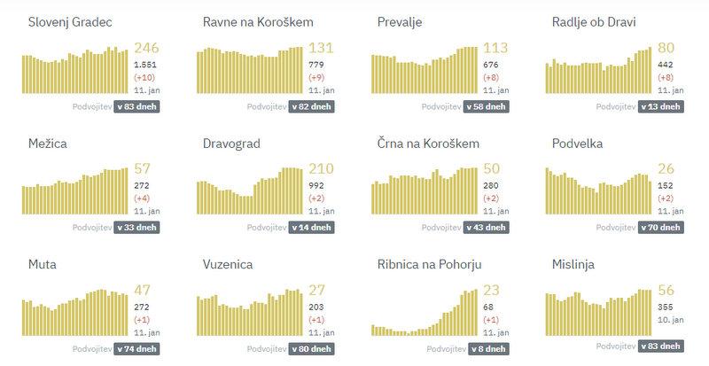 Na Koroškem so največ novih okužb v ponedeljek potrdili v Slovenj Gradcu, in sicer 10. Na Ravnah na Koroškem 9, v Radljah ob Dravi in na Prevaljah po 8, v Mežici 4, v Dravogradu, Podvelki in Črni na Koroškem po 2, na Muti, v Ribnici na Pohorju in v Vuzenici pa po 1.