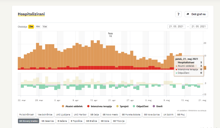 V Splošni bolnici Slovenj Gradec se po zadnjih podatkih Covid-19 sledilnika zdravijo 3 covidni pacienti, vsi na akutnem oddelku. V bolnišnico niso sprejeli novega pacienta, tudi v domačo oskrbo ne. Umrl ni nihče.
