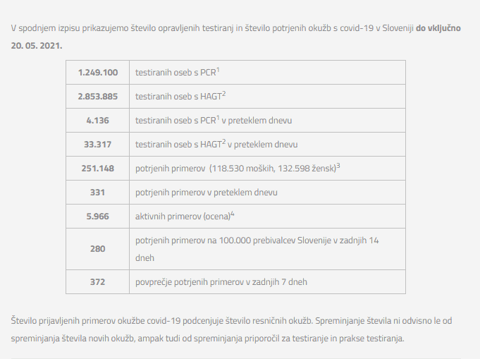 Število opravljenih testiranj in število potrjenih okužb s covidom-19 do vključno 20. 5. 2021: