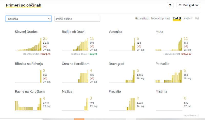 V zadnjih sedmih dneh so v koroških občinah potrdili skupno 62 okužb, tako povprečje potrjenih primerov znaša 8,9. Po podatkih Sledilnika za covid-19 je v regiji skupno 83 aktivno okuženih, največ v občinah Slovenj Gradec in Radlje ob Dravi. Edina občina brez aktivnih okužb je Mislinja.