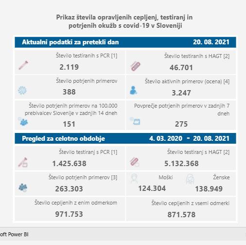 Trenutno je v državi po ocenah NIJZ aktivnih primerov okužb 3.247 (dan pred tem 2.992). Sedemdnevno povprečje števila potrjenih okužb pa znaša 275 (dan prej 257). Medtem je 14-dnevno povprečje števila okužb na 100.000 prebivalcev znašalo 151, dan pred tem 139.