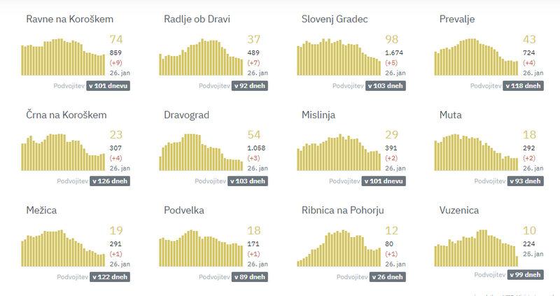 Največ novih okužb so na Koroškem potrdili na Ravnah na Koroškem, in sicer 9. V Radljah ob Dravi 7, v Slovenj Gradcu 5, na Prevaljah in v Črni na Koroškem po 4, v Dravogradu 3, v Mislinji in na Muti po 2, v Mežici, Podvelki in Ribnici na Pohorju pa po 1.