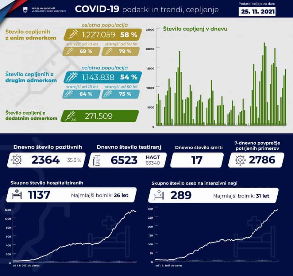Po zadnjih podatkih vlade v bolnišnicah zdravijo 1137 covidnih bolnikov, dan prej 1145. Intenzivno zdravljenje jih potrebuje 289, dan prej 286. Umrlo je 17 covidnih bolnikov.