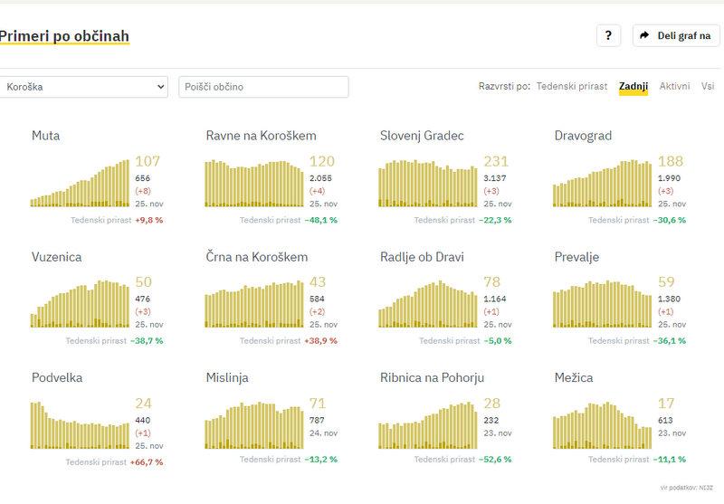 Na Koroškem so včeraj potrdili 26 novih okužb, dan prej 80, pred tednom dni pa 66. Največ novih okužb so včeraj zabeležili na Muti, in sicer 8, na Ravnah na Koroškem 4, v Slovenj Gradcu, Dravogradu in Vuzenici po 3, v Črni na Koroškem 2, v Radljah ob Dravi, Prevaljah in v Podvelki pa po 1.