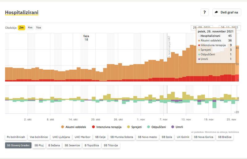 V SB Slovenj Gradec zdravijo 45 covidnih bolnikov, od teh jih 9 potrebuje intenzivno terapijo. V bolnišnico so na novo sprejeli 3 osebe, v domačo oskrbo so odpustili eno, ena pa je umrla.