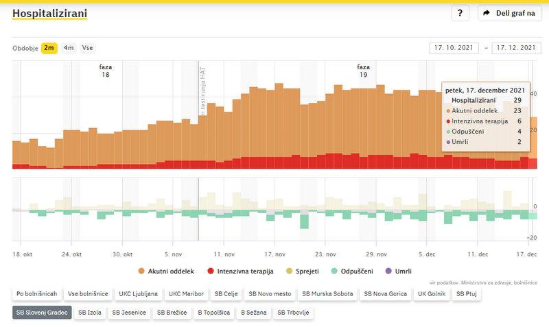 Po podatkih sledilnika v SB Slovenj Gradec zdravijo 29 covidnih bolnikov, od teh jih 6 potrebuje intenzivno zdravljenje. V domačo oskrbo so odpustili 4 osebe, 2 osebi sta umrli. .