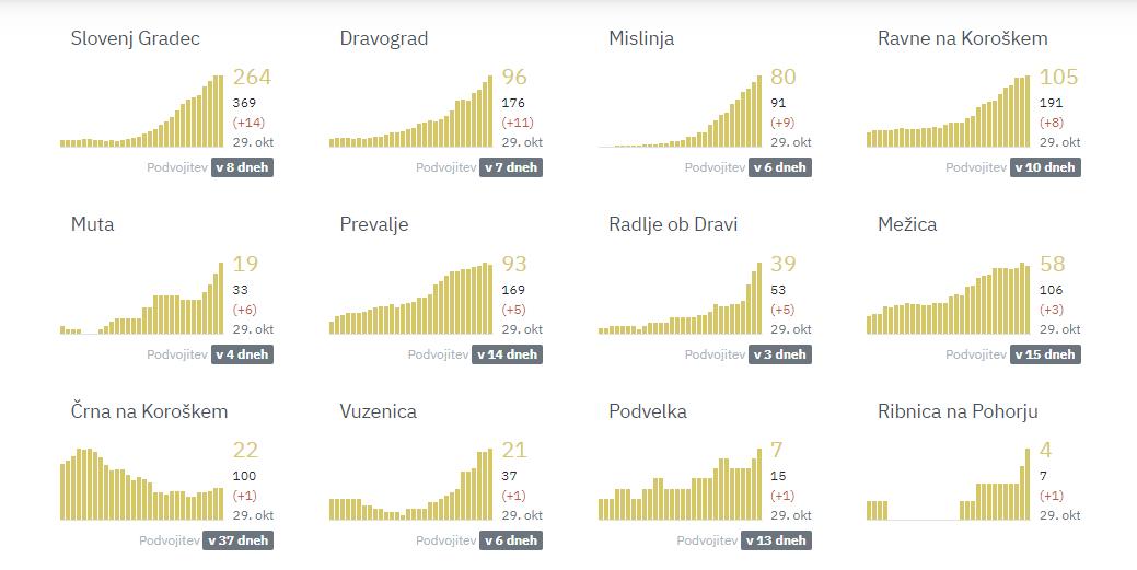 Slovenj Gradec 14, Dravograd 11, Mislinja 9, Ravne na Koroškem 8, Muta 6, Prevalje 5, Radlje ob Dravi 5, Mežica 3, Črna na Koroškem 1, Vuzenica 1, Podvelka 1, Ribnica na Pohorju 1.