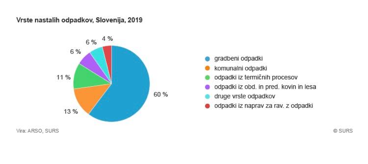Po podatkih Statističnega urada RS je v Sloveniji v letu 2019 nastalo 8,4 milijona ton vseh vrst odpadkov, od tega skoraj 5,1 milijona ton ali 60 % gradbenih odpadkov. Celotna količina v Sloveniji nastalih odpadkov sicer v 2019 ni bila veliko večja kot v 2018 (za 1 %), večja pa je bila med temi odpadki količina komunalnih odpadkov (za 5 %).