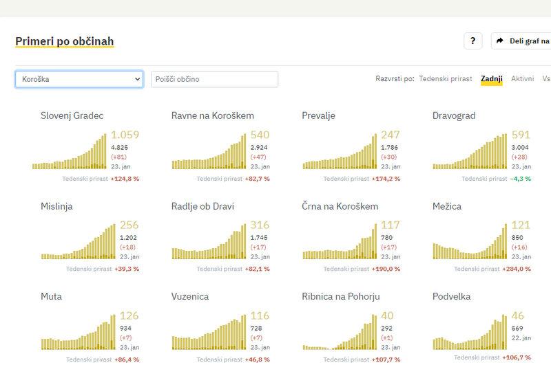 Na Koroškem so včeraj potrdili 269 novih okužb, dan pred tem 580, pred tednom dni pa 267. Včeraj so jih največ potrdili v Slovenj Gradcu, in sicer 81, na Ravnah na Koroškem 47, na Prevaljah 30, v Dravogradu 28, v Mislinji 18, v Radljah ob Dravi in Črni na Koroškem po 17, v Mežici 16, na Muti 7 in Vuzenici po 7, v Ribnici na Pohorju 1.