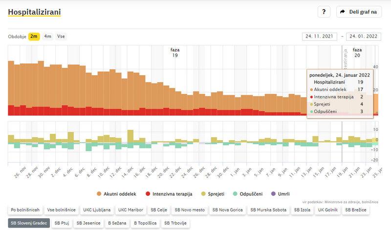 Po zadnjih podatkih vlade v bolnišnicah zdravijo 636 covidnih bolnikov, dan prej 608, od tega 135 na intenzivni negi, dan prej 135. V soboto je umrlo 14 covidnih bolnikov. Po podatkih sledilnika v SB Slovenj Gradec zdravijo 19 covidnih bolnikov. Od teh 2 potrebujeta intenzivno zdravljenje. Na novo so v bolnišnico sprejeli 4 osebe, 3 so odpustili v domačo oskrbo.