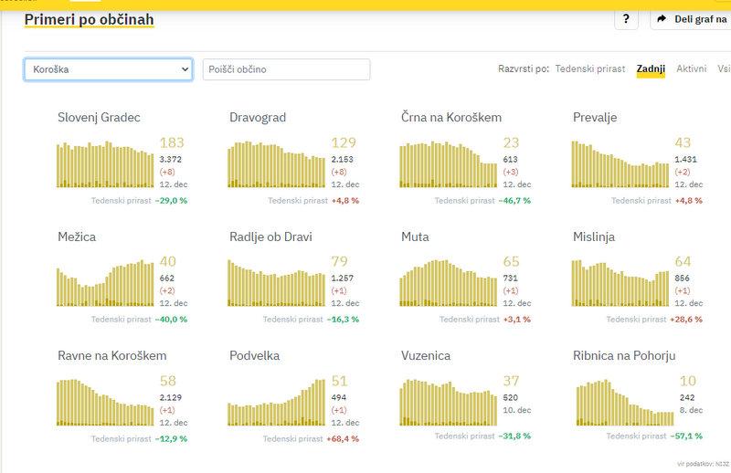 Včeraj so na Koroškem potrdili 28 novih okužb, dan prej 20, pred tednom dni pa 36. V Slovenj Gradcu in Dravogradu so jih zabeležili po 8, v Črni na Koroškem 3, na Prevaljah in v Mežici po 2, v Radljah ob Dravi, na Muti, v Mislinji, na Ravnah na Koroškem in Podvelki pa po 1.