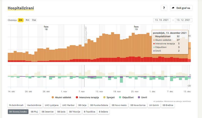 Po podatkih sledilnika v SB Slovenj Gradec zdravijo 32 covidnih bolnikov, od teh jih 5 potrebuje intenzivno zdravljenje. V domačo oskrbo so odpustili 3 osebe, dva bolnika pa sta umrla.
