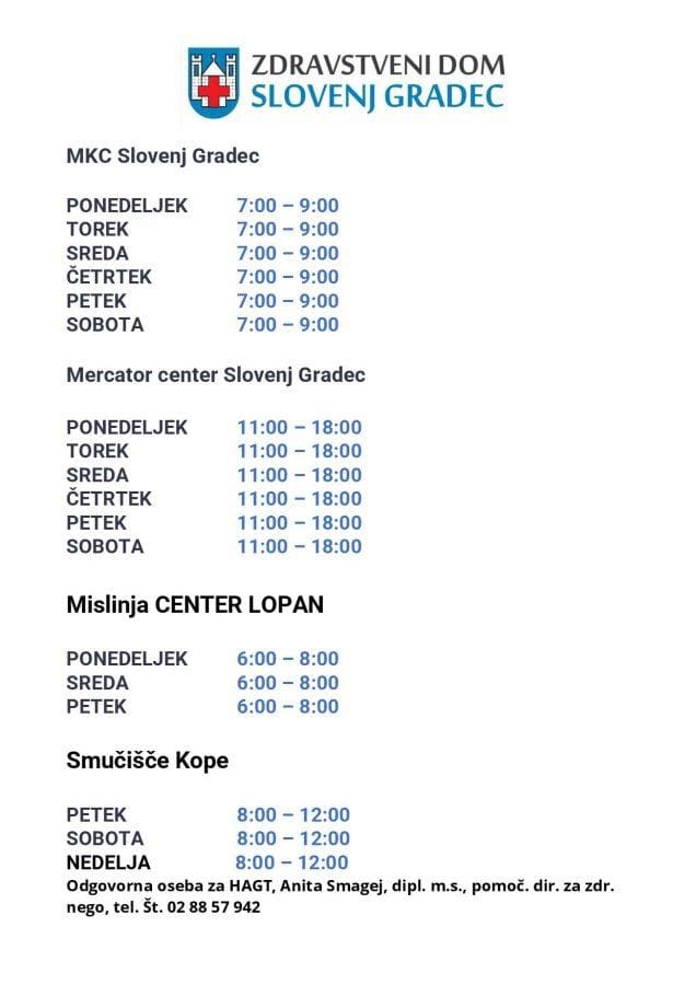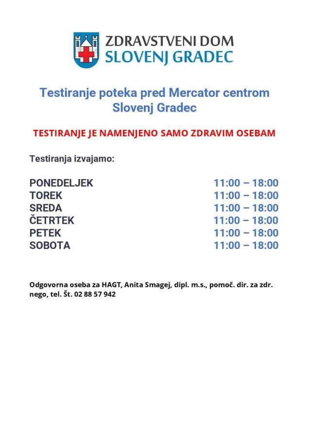 Iz ZD Slovenj Gradec so posredovali urnik testiranj s hitrimi antigenskimi testi, ki jih izvaja Zdravstveni dom Slovenj Gradec. Kot so dodali, se s 13. decembrom 2021 dodatno hitri testi izvajajo tudi pri Mercator centru Slovenj Gradec.