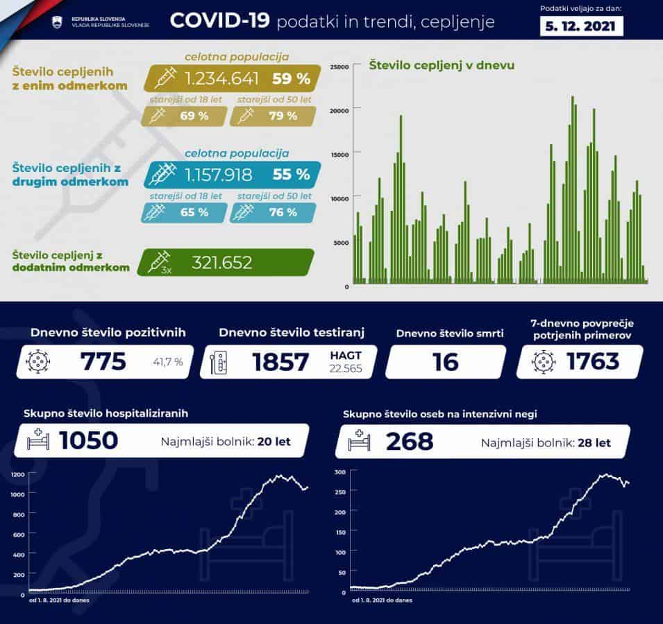 Po zadnjih podatkih vlade v bolnišnicah zdravijo 1050 covidnih bolnikov, Intenzivno zdravljenje jih je potrebovalo 268. Umrlo je 16 covidnih bolnikov.