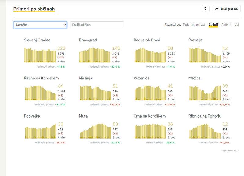 Na Koroškem so včeraj potrdili 36 novih okužb, največ v Slovenj Gradcu, in sicer 10. V Dravogradu 5, v Radljah ob Dravi in na Prevaljah po 4, v Ravnah na Koroškem, Mislinji, Vuzenici, Mežici, Podvelki po 2, na Muti, v Črni na Koroškem in Ribnici na Pohorju pa po 1.