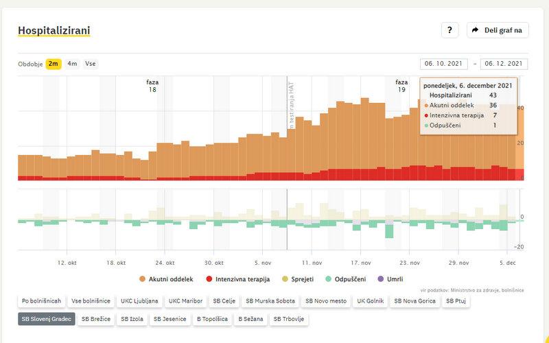 Po podatkih sledilnika v SB Slovenj Gradec zdravijo 43 covidnih bolnikov, od teh jih 7 potrebuje intenzivno zdravljenje. V domačo oskrbo so odpustili 1 osebo.