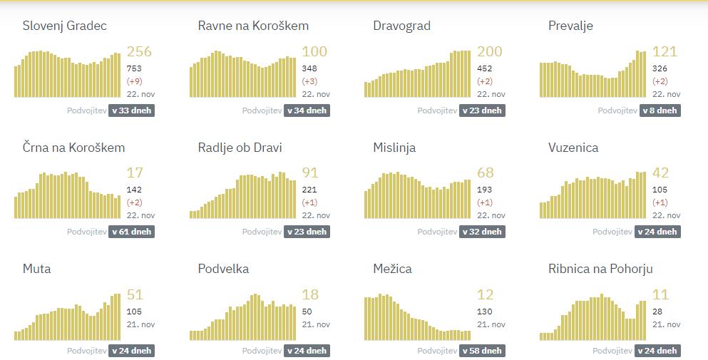 Slovenj Gradec 9, Ravne na Koroškem 3, Dravograd 2, Prevalje 2, Črna na Koroškem 2, Radlje ob Dravi 1, Mislinja 1, Vuzenica 1.