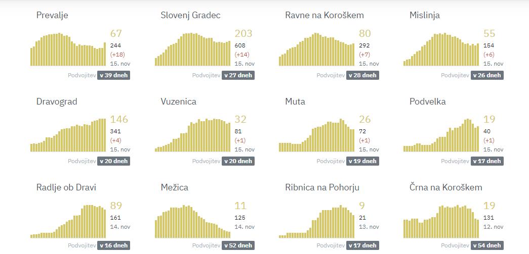 V nedeljo so največji delež aktivno okuženih z novim koronavirusom beležili v prekmurskih občinah Rogašovci (3,485 %), Beltinci (3,013 %) in Kuzma (2,922 %), visok delež trenutno okuženih so imeli tudi v Radencih (2,154 %) in Turnišču (2,208 %). Med ostalimi občinami sta izstopala še Bovec z 2,310 odstotka aktivnih okužb in Preddvor (2,218 %).