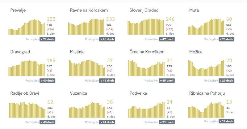 Največ novih okužb so na Koroškem v nedeljo potrdili na Prevaljah, in sicer 16. Na Ravnah na Koroškem 14, v Slovenj Gradcu 13, na Muti 3, v Dravogradu, Črni na Koroškem, Mežici in v Mislinji po 2, v Radljah ob Dravi, v Vuzenici in Podvelki pa so odkrili po eno novo okužbo.