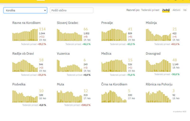 Največ novih okužb so tudi v petek potrdili na Ravnah na Koroškem, kjer so jih zabeležili 11, v Slovenj Gradcu 8, na Prevaljah 5, v Mislinji 4, v Radljah in Vuzenici po 2 in v Mežici 1.