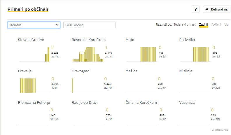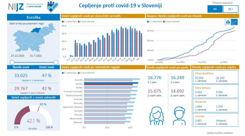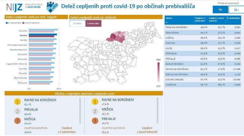 Na Koroškem je bilo Doslej je bilo s prvim odmerkom cepiva cepljenih 33.025 oz. okoli 47 odstotkov oseb, z vsemi potrebnimi odmerki pa 29.767 oz. okoli 42 odstotkov oseb, kažejo podatki NIJZ. Med koroškimi občinami pa so po precepljenosti še vedno na prvem mestu Ravne na Koroškem.
