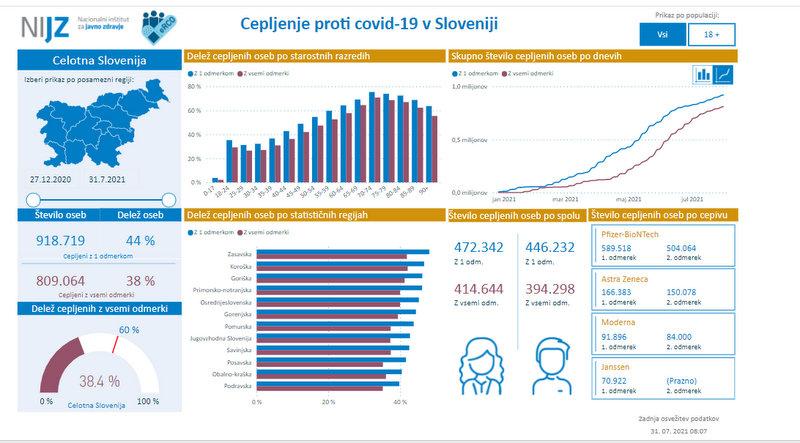 Doslej je bilo s prvim odmerkom cepiva cepljenih 918.719 oz. okoli 44 odstotkov oseb, z vsemi potrebnimi odmerki pa 809.064 oz. okoli 38 odstotkov oseb, kažejo podatki NIJZ.