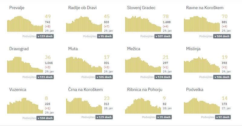 Na Koroškem so v petek največ novih okužb potrdili na Prevaljah, in sicer 8. V Radljah ob Dravi 7, v Slovenj Gradcu in na Ravnah na Koroškem po 4, v Dravogradu in na Muti po 3. V Mežici, Mislinji in Vuzenici pa po 1 novo okužbo.