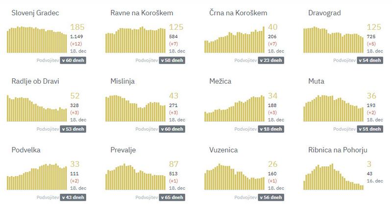 Največ novih okužb so v petek na Koroškem zabeležili v Slovenj Gradcu, in sicer 12, v Črni na Koroškem in na Ravnah na Koroškem po 7, v Dravogradu 5, v Radljah ob Dravi, Mislinji in Mežici po 3, na Muti in v Podvelki po 2, v Vuzenici in na Prevaljah pa po 1.