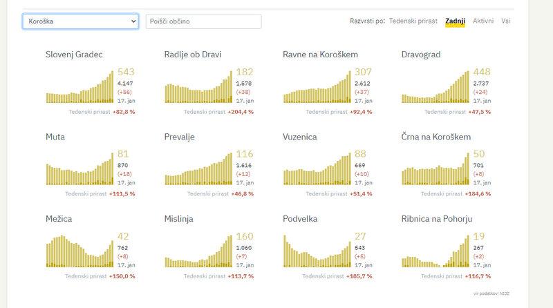 Na Koroškem so včeraj potrdili 225 novih okužb, dan prej 267, pred tednom dni pa 153. V Slovenj Gradcu so jih zabeležil 56, v Radljah ob Dravi 38, na Ravnah na Koroškem 37, v Dravogradu 24, na Muti 18, na Prevaljah 12, v Vuzenici 10, v Črni na Koroškem in Mežici po 8, v Mislinji 7, v Podvelki 5, v Ribnici na Pohorju pa 2.