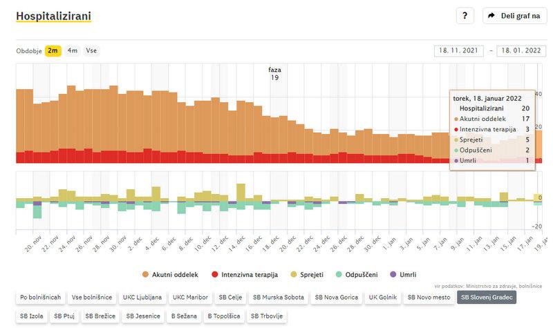 Po podatkih sledilnika v SB Slovenj Gradec zdravijo 20 covidnih bolnikov. Od teh 3 potrebujejo intenzivno zdravljenje. Na novo so v bolnišnico sprejeli 5 oseb, 2 so odpustili v domačo oskrbo, 1 pa je umrla.