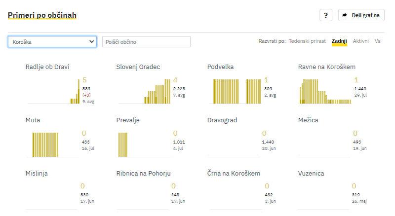 Na Koroškem so včeraj potrdili 3 nove okužbe, in sicer vse v Radljah ob Dravi. V Zadnjih sedmih dneh so jih v vseh občinah skupaj zabeležili 6, tako da sedemdnevno povprečje potrjenih primerov znaša 0,86.