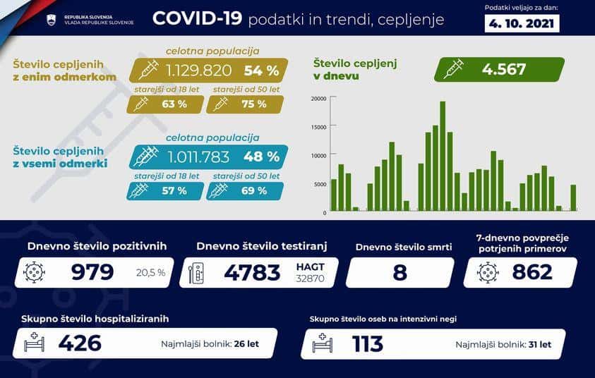 Z enim odmerkom cepiva proti covidu-19 je pri nas po podatkih vlade cepljenih 1.129.820 ljudi oz. 54 odstotkov prebivalstva. Med starejšimi od 18 let je z enim odmerkom precepljenih 63 odstotkov, med starejšimi od 50 let pa 75 odstotkov. Z vsemi odmerki cepiva pa je cepljenih 1.011.783 prebivalcev, kar je 48 odstotkov celotnega prebivalstva, 57 odstotkov med starejšimi od 18 let in 69 odstotkov starejših od 50 let.
