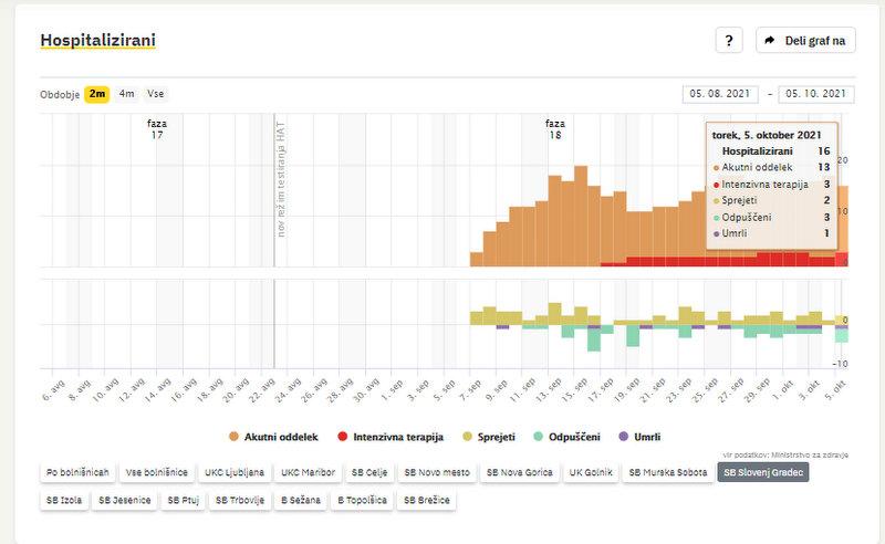 V SB Slovenj Gradec zdravijo 16 covidnih bolnikov, kažejo podatki sledilnika. Intenzivno terapijo potrebujejo 3. Umrl je en bolnik s potrjeno okužbo.