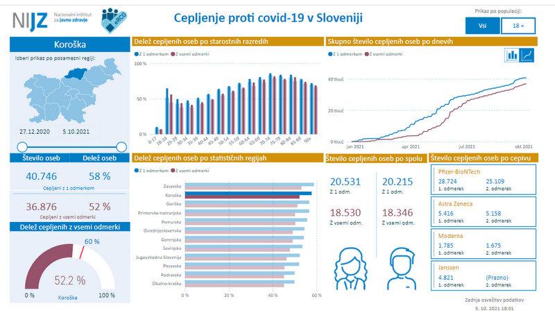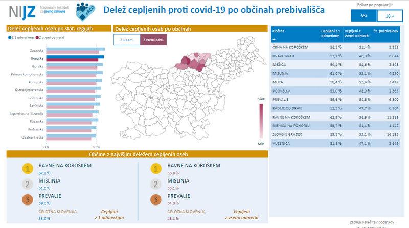 Z enim odmerkom cepiva proti covidu-19 je na Koroškem po podatkih NJZ cepljenih 40.746 ljudi oz. 58 odstotkov prebivalstva. Z vsemi odmerki cepiva pa je cepljenih 36.876 Korošcev, kar je 52,2 odstotka. V regiji je največ precepljenih na Ravnah, sledi Mislinja, na tretjem mestu so Prevalje.