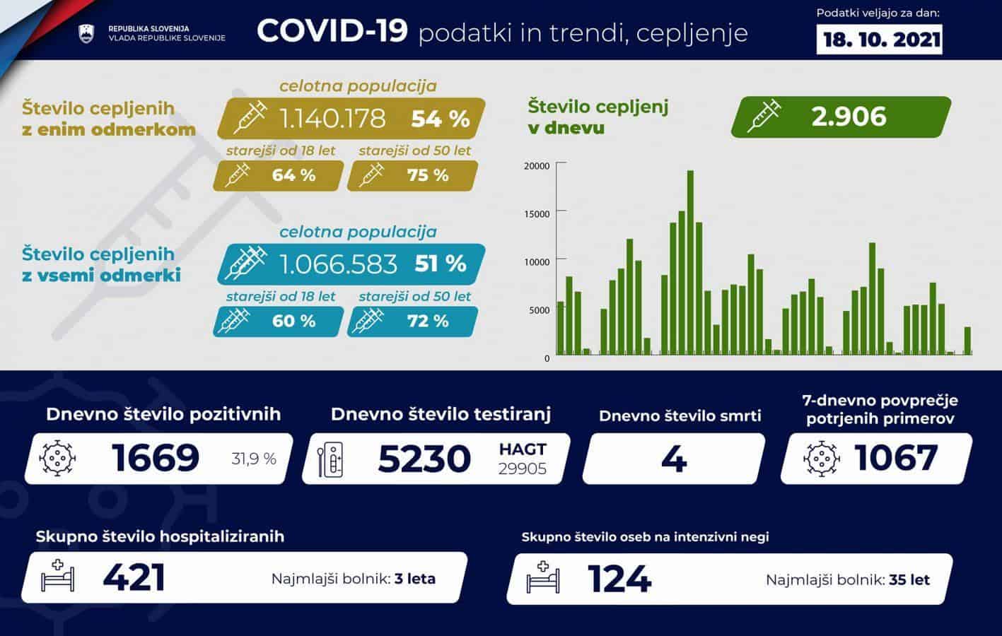Z enim odmerkom cepiva proti covidu-19 je pri nas po podatkih vlade cepljenih 1.140.178 ljudi oz. 54 odstotkov prebivalstva. Med starejšimi od 18 let je z enim odmerkom cepljenih 64 odstotkov, med starejšimi od 50 let pa 75 odstotkov. Z vsemi odmerki cepiva je cepljenih 1.066.583 prebivalcev, kar je 51 odstotkov celotnega prebivalstva, 60 odstotkov med starejšimi od 18 let in 72 odstotkov starejših od 50 let.