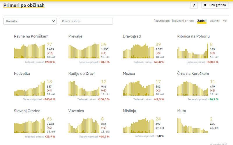 Na Koroškem so včeraj potrdili 43 novih okužb, največ na Ravnah na Koroškem, kjer so jih zabeležili 13, na Prevaljah 7, v Dravogradu in Ribnici na Pohorju po 5, v Podvelki 4, v Radljah ob Dravi 3, v Mežici in Črni po 2, v Slovenj Gradcu in Vuzenici po 1.