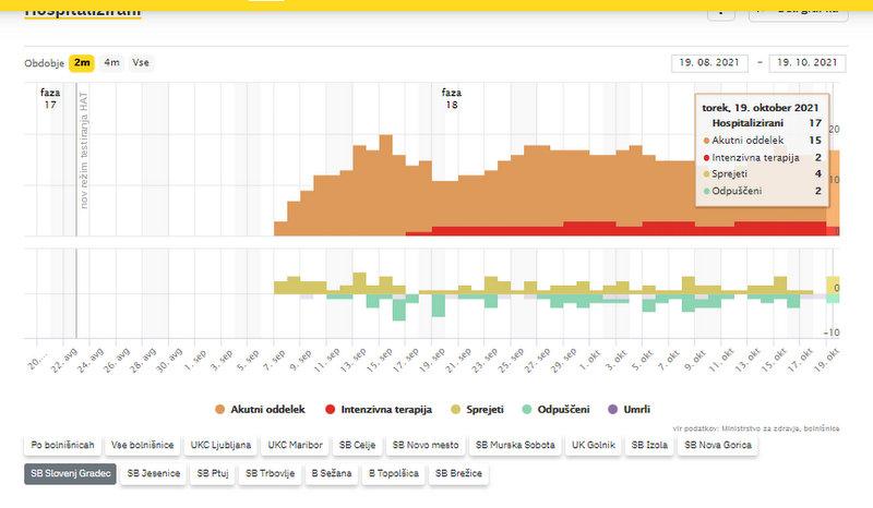 V ponedeljek so v državi opravili tudi 29.905 hitrih testov, ki jih v primeru pozitivnega izvida praviloma preverijo še s PCR-testi. V bolnišnicah po podatkih vlade zdravijo 421 ljudi, 124 jih potrebuje intenzivno zdravljenje. V ponedeljek so umrle štiri osebe. V Splošni bolnišnici Slovenj Gradec zdravijo 17 covidnih bolnikov, od teh dva potrebujeta intenzivno terapijo.