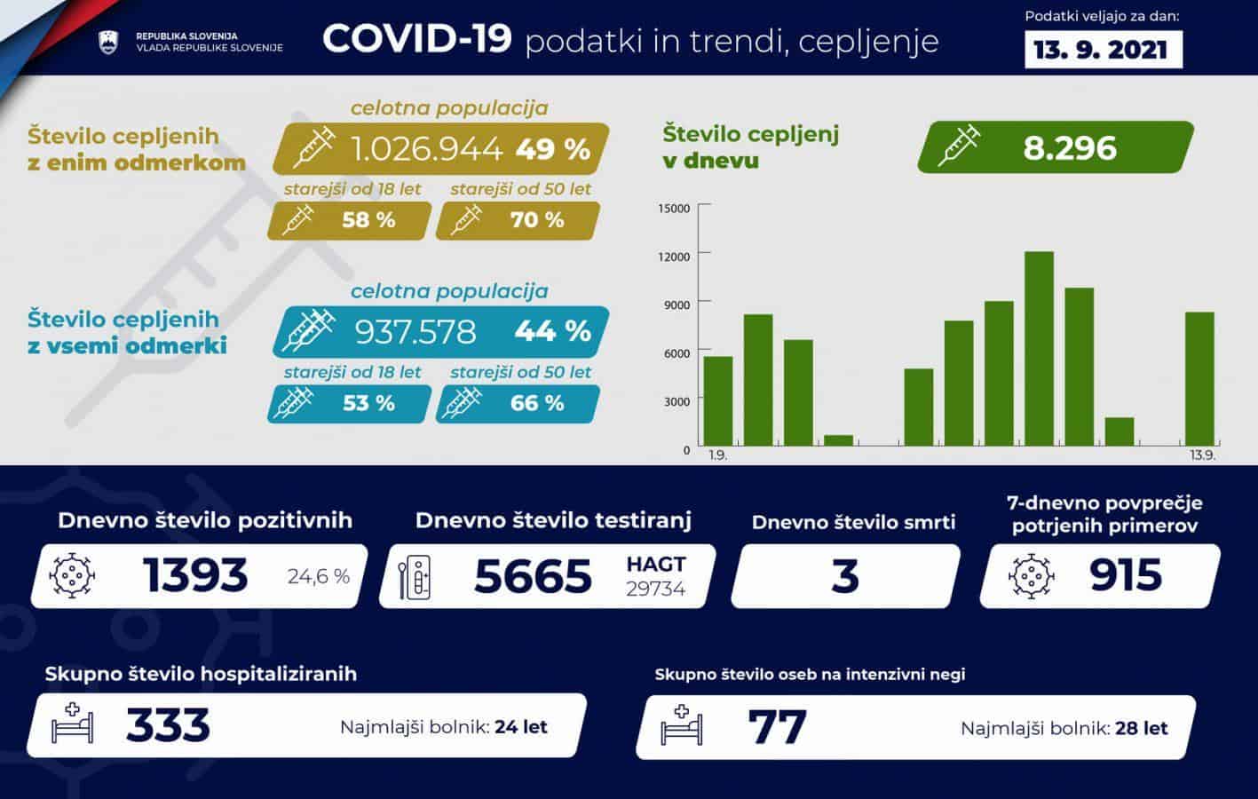 Z enim odmerkom cepiva proti covidu-19 je pri nas cepljenih 1.026.944 oseb oz. 49 odstotkov vseh prebivalcev, z vsemi odmerki pa 937.578 ljudi, kar je 44 odstotkov vseh prebivalcev.