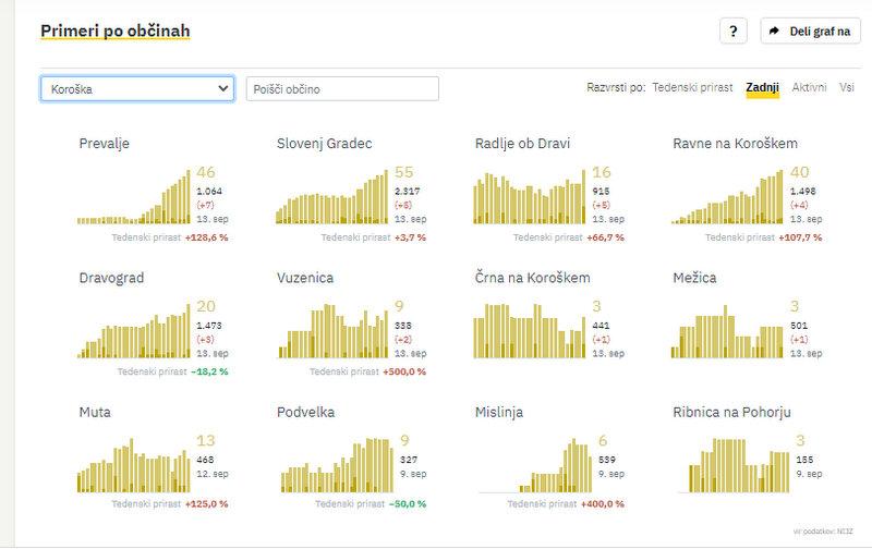 Na Koroškem so včeraj nove okužbe potrdili v osmih občinah. Največ na Prevaljah, kjer so jih zabeležili 7, v Slovenj Gradcu in Radljah ob Dravi so jih potrdili po 5, na Ravnah na Koroškem po 4, v Dravogradu 3, v Vuzenici 2, v Črni na Koroškem in Mežici pa po 1.