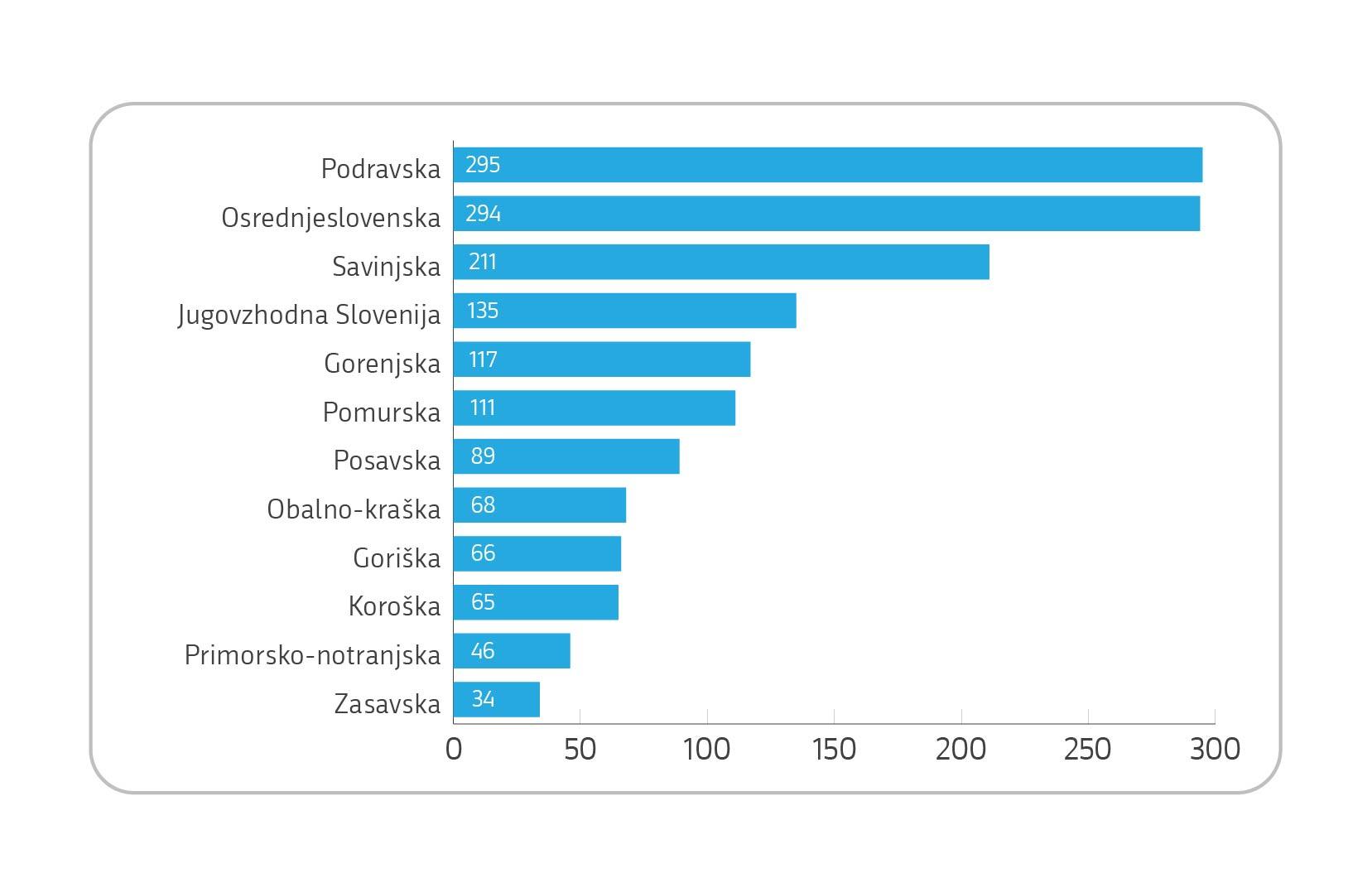 občina novi skupaj aktivni aktivni (%) -------------------------------------------------------------- Ljubljana 176 10865 1912 0,650 Maribor 61 4082 1273 1,136 Kranj 38 2982 422 0,744 Domžale 36 1894 295 0,810 Velenje 24 1871 508 1,516 Novo mesto 40 1832 555 1,489 Celje 32 1813 418 0,843 Kamnik 28 1588 283 0,948 Slovenska Bistrica 51 1504 441 1,717 Škofja Loka 15 1423 167 0,719 Jesenice 7 1231 191 0,902 Murska Sobota 15 1176 299 1,595 Ptuj 3 1097 280 1,194 Radovljica 6 1076 147 0,772 Koper 44 1052 397 0,756 Krško 79 1041 528 2,022 Šentjur 17 1027 237 1,235 Slovenj Gradec 4 1003 244 1,470 Žalec 20 916 225 1,050 Grosuplje 11 905 132 0,621 Sevnica 25 860 278 1,581 Nova Gorica 9 731 218 0,683 Tržič 16 728 112 0,752 Trebnje 21 723 229 1,759 Medvode 14 713 151 0,907 Slovenske Konjice 5 700 212 1,414 Brežice 33 690 218 0,902 Zagorje ob Savi 20 689 184 1,118 Ivančna Gorica 16 658 153 0,906 Postojna 23 651 252 1,540 Vrhnika 19 645 166 0,951 Beltinci 8 629 134 1,655 Dravograd 2 619 157 1,774 Litija 11 602 130 0,843 Lendava 3 587 138 1,319 Idrija 9 545 194 1,644 Ilirska Bistrica 12 539 135 1,016 Kočevje 9 535 110 0,701 Šmarje pri Jelšah 4 531 82 0,798 Trbovlje 14 520 130 0,811 Šoštanj 8 513 131 1,500 Vojnik 10 510 162 1,831 Ljutomer 2 498 104 0,923 Ravne na Koroškem 6 487 138 1,220 Železniki 6 484 48 0,717 Mengeš 3 477 67 0,822 Laško 8 463 142 1,090 Brezovica 5 462 88 0,702 Ajdovščina 9 460 97 0,501 Črnomelj 19 460 156 1,090 Šenčur 5 458 75 0,857 Lenart 7 456 143 1,694 Rogaška Slatina 13 455 102 0,917 Prevalje 4 452 116 1,703 Ormož 2 445 132 1,103 Hoče - Slivnica 3 416 95 0,802 Škofljica 4 412 47 0,412 Hrastnik 15 403 69 0,755 Tolmin 26 403 92 0,834 Gorenja vas - Poljane 4 400 47 0,622 Izola 9 390 178 1,088 Logatec 3 383 70 0,492 Gornja Radgona 2 381 75 0,893 Piran 10 381 119 0,673 Puconci 2 367 63 1,069 Zreče 1 362 84 1,291 Bled 6 361 61 0,777 Cerklje na Gorenjskem 8 356 62 0,804 Polzela 10 346 150 2,410 Šentjernej 8 346 116 1,621 Metlika 11 342 56 0,667 Šmartno pri Litiji 45 336 170 3,020 Lukovica 4 329 47 0,799 Preddvor 19 317 86 2,326 Pesnica 13 310 91 1,236 Cerknica 6 307 142 1,222 Rače - Fram 7 298 101 1,359 Radlje ob Dravi 5 288 55 0,890 Šentilj 6 285 95 1,132 Poljčane 4 281 100 2,243 Ig 5 277 57 0,752 Radenci 2 274 67 1,312 Komenda 5 273 34 0,536 Moravče 4 273 42 0,773 Sežana 8 271 56 0,414 Ribnica 9 270 53 0,557 Duplek 3 262 79 1,136 Bohinj 2 261 27 0,528 Kranjska Gora 2 258 36 0,692 Braslovče 4 253 68 1,218 Dobrova - Polhov Gradec 2 251 47 0,606 Kidričevo 1 251 74 1,139 Moravske Toplice 2 249 80 1,367 Naklo 2 248 37 0,685 Gorišnica 2 246 79 1,928 Oplotnica 6 245 75 1,816 Tišina 5 245 67 1,688 Markovci 240 76 1,900 Ruše 2 237 61 0,867 Črenšovci 11 233 57 1,440 Mislinja 1 231 35 0,767 Videm 2 228 57 1,020 Dol pri Ljubljani 5 226 35 0,556 Mozirje 1 223 59 1,428 Miklavž na Dravskem polju 221 53 0,776 Turnišče 5 220 61 1,924 Prebold 5 219 74 1,444 Rogašovci 3 214 36 1,173 Vodice 2 211 33 0,665 Žirovnica 1 205 34 0,776 Pivka 2 201 42 0,680 Križevci 1 198 53 1,495 Štore 2 198 42 0,918 Starše 2 196 40 0,997 Hajdina 3 185 34 0,883 Dolenjske Toplice 5 182 60 1,702 Žužemberk 4 182 45 0,968 Žiri 1 177 16 0,326 Majšperk 3 176 55 1,352 Črna na Koroškem 173 30 0,914 Kuzma 173 20 1,271 Muta 7 172 61 1,790 Straža 5 162 56 1,431 Lovrenc na Pohorju 1 161 26 0,874 Mežica 1 159 27 0,759 Horjul 3 157 25 0,825 Selnica ob Dravi 2 157 45 1,005 Šmartno ob Paki 5 154 36 1,101 Borovnica 5 153 24 0,528 Bovec 1 153 10 0,325 Gornji Grad 2 153 41 1,636 Log - Dragomer 148 23 0,629 Vuzenica 5 148 38 1,435 Odranci 2 147 26 1,582 Trzin 3 147 25 0,637 Velike Lašče 1 147 28 0,639 Vipava 147 33 0,586 Šmarješke Toplice 1 144 58 1,706 Kungota 143 38 0,803 Dobrepolje 5 140 26 0,677 Mirna 5 139 43 1,640 Cerkno 6 136 51 1,114 Ljubno 2 134 42 1,649 Renče - Vogrsko 1 134 24 0,550 Mokronog - Trebelno 5 133 51 1,656 Semič 7 132 35 0,912 Mirna Peč 3 130 44 1,473 Grad 4 128 49 2,375 Šentrupert 7 127 52 1,746 Gorje 2 126 12 0,436 Brda 1 123 19 0,337 Sv. Jurij v Sl. goricah 4 122 46 2,208 Sveti Jurij ob Ščavnici 120 42 1,506 Apače 119 46 1,302 Rečica ob Savinji 1 118 41 1,757 Dornava 1 116 30 1,037 Gornji Petrovci 1 113 29 1,456 Komen 113 10 0,282 Divača 1 112 29 0,691 Radeče 112 27 0,648 Podčetrtek 111 27 0,786 Makole 110 20 0,988 Šempeter - Vrtojba 1 110 24 0,384 Vitanje 1 110 24 1,064 Dobrna 1 108 19 0,848 Škocjan 108 41 1,232 Hrpelje - Kozina 3 105 41 0,904 Rogatec 1 104 15 0,485 Destrnik 102 19 0,726 Cirkulane 101 30 1,270 Velika Polana 1 98 34 2,408 Sveta Ana 3 96 35 1,524 Vransko 1 95 17 0,649 Benedikt 2 92 42 1,625 Cankova 3 90 25 1,450 Loška dolina 8 90 35 0,922 Sveti Tomaž 1 89 19 0,951 Podvelka 4 88 35 1,493 Nazarje 1 87 28 1,074 Kozje 2 82 20 0,655 Cerkvenjak 2 81 28 1,346 Miren - Kostanjevica 2 81 19 0,382 Sodražica 1 81 5 0,228 Juršinci 2 78 26 1,098 Sv. Trojica v Sl. goricah 3 77 24 1,152 Kostanjevica na Krki 3 76 24 0,982 Luče 74 23 1,584 Podlehnik 1 72 15 0,838 Ankaran 1 70 21 0,653 Kobarid 1 68 13 0,319 Kanal ob Soči 1 64 14 0,264 Bistrica ob Sotli 2 63 21 1,575 Veržej 1 63 14 1,085 Tabor 2 62 18 1,085 Šalovci 1 56 12 0,868 Zavrč 56 15 0,978 Dobrovnik 2 51 13 1,010 Sv. Andraž v Sl. goricah 2 44 11 0,927 Ribnica na Pohorju 41 11 0,978 Središče ob Dravi 1 41 18 0,923 Žetale 41 12 0,925 Loški Potok 37 9 0,497 Trnovska vas 36 9 0,667 Dobje 34 7 0,725 Razkrižje 34 13 1,024 Kobilje 3 31 22 4,037 Jezersko 1 27 8 1,260 Bloke 3 23 9 0,574 Solčava 2 19 7 1,354 Hodoš 12 3 0,838 Kostel 11 2 0,311 Osilnica 4 2 0,546 tuji državljani 14 464 102 ------------------------------------------------------------- SKUPAJ 1627 87936 20863