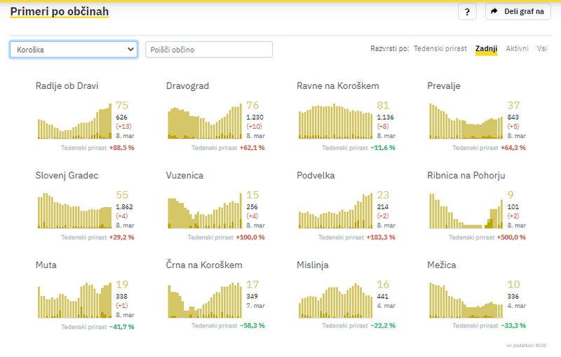 Na Koroškem so največ novih okužb potrdili v Radljah ob Dravi, in sicer 13. Sledi Dravograd z 10 novimi okužbami. Na Ravnah na koroškem so jih potrdili 8, na Prevaljah 5, v Slovenj Gradcu in v Vuzenici po 4, po dve novi okužbi so zabeležili v Podvelki in Ribnici na Pohorju, na Muti pa eno.