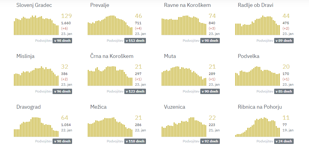 Slovenj Gradec 6, Prevalje 4, Ravne na Koroškem 3, Radlje ob Dravi 2, Mislinja 2, Črna 1, Muta 1, Podvelka 1.