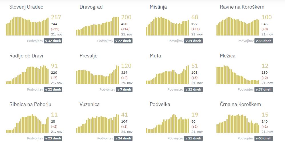 Slovenj Gradec 31, Dravograd 14, Mislinja 11, Ravne na Koroškem 8, Radlje ob Dravi 7, Prevalje 4, Muta 3, Mežica 2, Ribnica na Pohorju 2, Vuzenica 1, Podvelka 1, Črna na Koroškem 1.