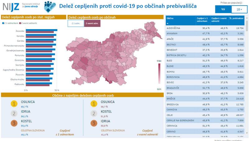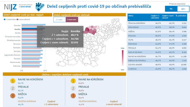 Po podatkih NIJZ je bilo pri v Sloveniji z enim odmerkom cepiva proti covidu-19 doslej cepljenih 972.303 oseb, z vsemi potrebnimi odmerki pa 872.103 oseb. Na Koroškem je z enim odmerkom cepiva proti covidu-19 doslej cepljenih 34.764 oseb, z vsemi potrebnimi odmerki pa 32.015 oseb.