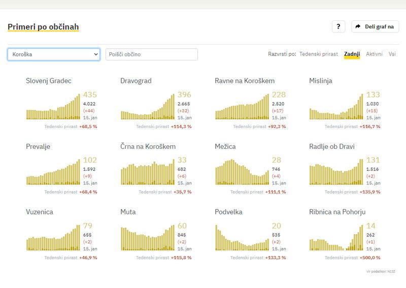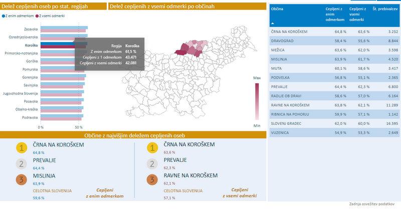 Na Koroškem so včeraj nove okužbe potrdili v vseh občinah, skupno so jih zabeležili 136. V Slovenj Gradcu so jih potrdili 44, v Dravogradu 32, na Ravnah na Koroškem 17, v Mislinji 15, na Prevaljah 9, v Črni na Koroškem 6, v Mežici 4, v Radljah ob Dravi, Vuzenici, Podvelki in na Muti po 2, v Ribnici na Pohorju pa 1.