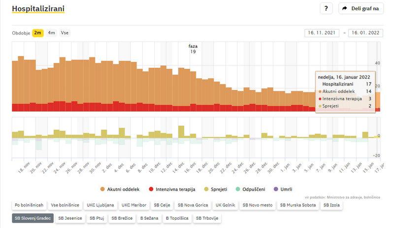 Po zadnjih podatkih vlade v bolnišnicah zdravijo 549 covidnih bolnikov, dan prej 514. od tega 156 na intenzivni negi, enako kot dan prej. V soboto je umrl 1 covidni bolnik. Po podatkih sledilnika v SB Slovenj Gradec zdravijo 17 covidnih bolnikov. Od teh 3 potrebujejo intenzivno zdravljenje. Na novo so v bolnišnico sprejeli 2 osebi.
