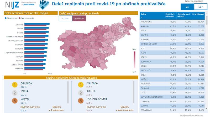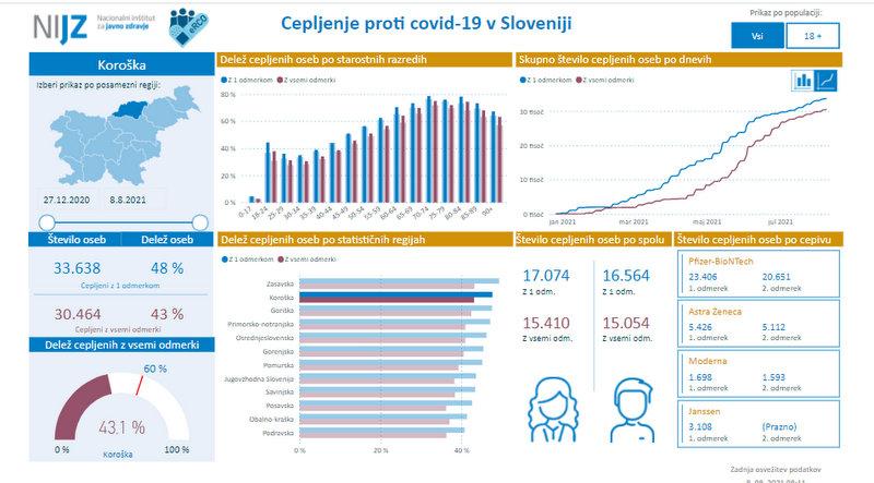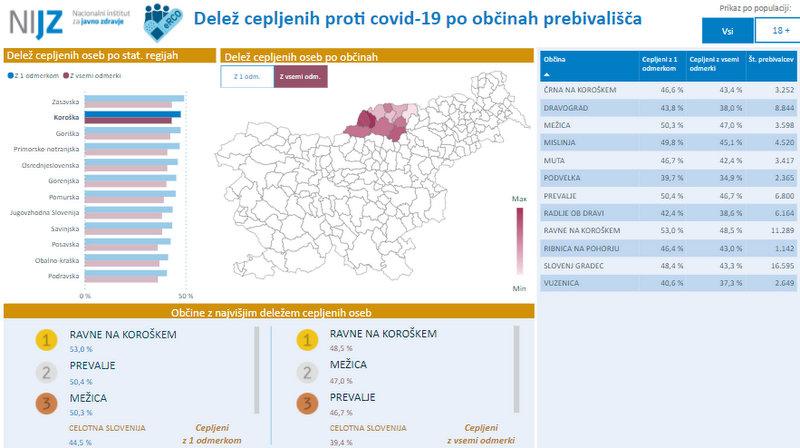 Z enim odmerkom cepiva je bilo doslej cepljenih 938.825, z vsemi potrebnimi odmerki pa 831.358 oseb oz. okoli 39 odstotkov vseh prebivalcev, kažejo podatki NIJZ. Med koroškimi občinami je največ cepljenih na Ravnah, z enim odmerkom so na drugem mestu Prevalje, na tretjem pa Mežica, ki pa zaseda drugo mesto pri cepljenih z vsemi odmerki.
