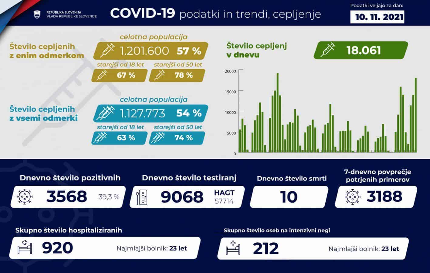 V bolnišnicah po podatkih vlade zdravijo 920 covidnih bolnikov ali 31 več kot dan prej. Intenzivno nego jih potrebuje 212 ali 21 več. Umrlo je 10 covidnih bolnikov. Najmlajši bolnik, ki potrebuje intenzivno zdravljenje, je star 23 let, prav toliko je star najmlajši bolnik na navadnem oddelku, je vlada objavila na Facebooku.