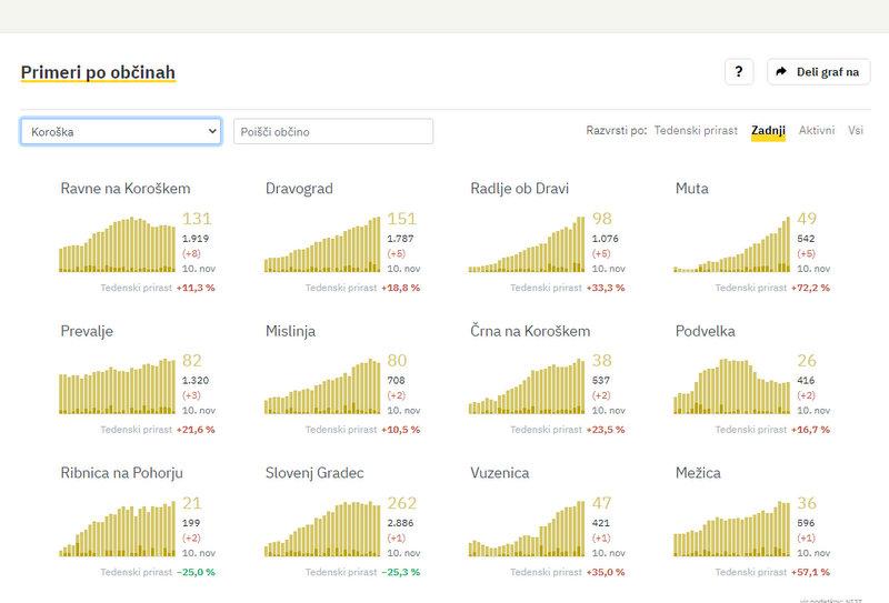 Na Koroškem so potrdili 37 novih okužb, dan pred tem 99. Največ so jih zabeležili na Ravnah na Koroškem, in sicer 8, v Dravogradu, Radljah ob Dravi, na Muti po 5, na Prevaljah 3, v Črni na Koroškem, Mislinji, Podvelki, Ribnici na Pohorju po 2, v Slovenj Gradcu, Vuzenici in Mežici pa po 1.